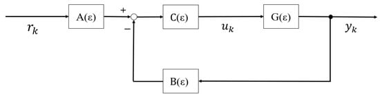 Following the block diagram shown in Figure 7, the error between the outputs of the real closed-loop system and the reference model given by Equation (14) can be written as