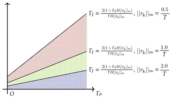 Figure 8 shows areas where the closed system is stable with regard to the control parameters and with various values of the sampling interval T. For a given supremum of the system input , the smaller the sampling period is, the wider the stability area becomes. □