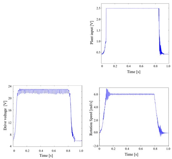 Figure 10 shows the plant input , the drive voltage , and the rotational speed of the motor for the analog driver. The integration gain of the analog driver was set at 10,000. It can be seen that the plan input of the analog drive is saturated at () corresponding to the maximum reference voltage of the operational amplifier. The saw-tooth wave compared with the operational amplifier in Figure 2 is () at the lower end and () at the upper end, indicating that the plant input exceeds the upper limit of the saw-tooth wave. At this time, the operational amplifier is in a state of constant amplification, which is not desirable considering the lifetime of the circuit element.