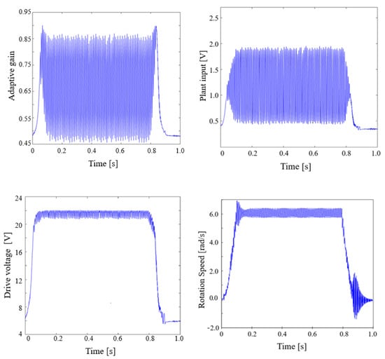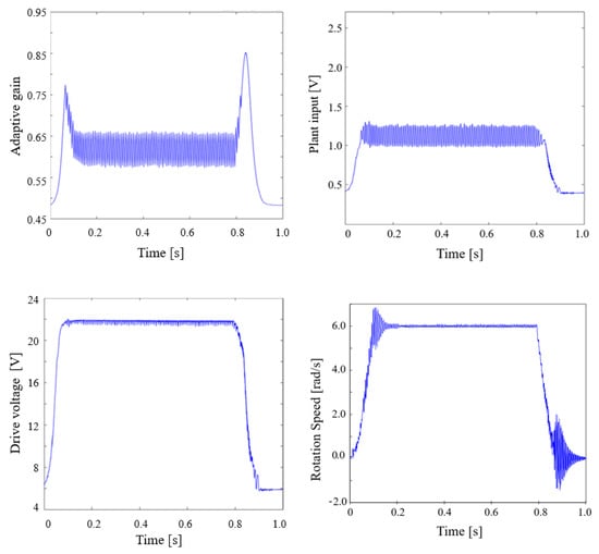 Figure 11 and Figure 12 show the plant input, the drive voltage, the rotational speed, and the adaptive gain of the proposed method for I regulator (, ) and the PI regulator ( and ), respectively. These control gains are tuned by trial and error to derive the smallest speed fluctuation by referring to the direction of the Ziegler–Nichols tuning method and satisfied the condition for the stability shown by Theorem 1. It can be seen in Figure 11 that the proposed method with only I regulator can improve the windup of the plant input that occurred with the analog controller. However, there are harmonic oscillations appearing on the plant input and the drive voltage. As a result, there is an oscillation accompanying the output rotational speed even for the steady-state.