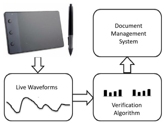 As shown in Figure 1, live features of the handwriting signature are used for verification with a document management system. That signature can be obtained by writing on an edge smart pad with an electromagnetic pen. There are four live waveforms that would be obtained, the X-axis value, the Y-axis value, pressure on the board, and velocity. Then these four elements would be used to process the verification algorithm. Unlike fingerprint and human face, live waveforms are more difficult to be copied by visual sensors.