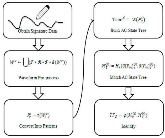 In this section, we propose a process algorithm for online signature verification. Figure 2 is the structure of the proposed signature verification process. First, we obtain the online signature data via an electromagnetic tablet (10.1 inch) with size 262 × 175 mm to capture dynamic data of signature. The data format of each signature point contains six aspects of information: (1) the ID of each point, (2) the X-axis value of the corresponding point, (3) the Y-axis value of the corresponding point, (4) the distance between pen and the pad screen, (5) pressure value, and (6) velocity (time). Figure 3 is the sample of signature points. Second, we preprocess those data and convert them into waveform style. Third, we convert those waveform data into patterns. Fourth, we build an AC state tree. Fifth, we match the AC state tree. Sixth, we complete the identification process.