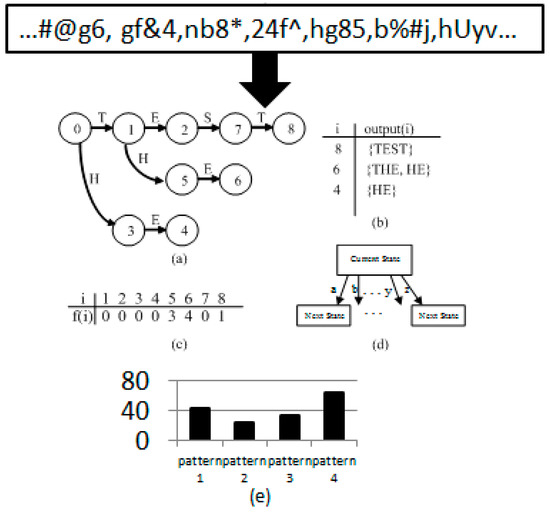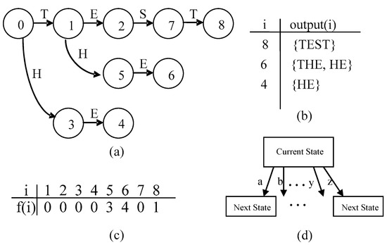 Aho-Corasick (AC) automata can be defined as 5-tuple symbols where is a finite set of states, is a finite set of input symbols (also called the alphabet), is a transition function, is a start state, and is a set of final states. The AC algorithm has preprocessing and matching stages. Before performing AC matching, one needs to construct a state machine from the patterns in the preprocessing stage. In an adaptation from the example in [1], Figure 4a–c describes the AC’s three major functions for patterns “TEST”, “THE”, and “HE”. Figure 4d describes the AC table implementation.