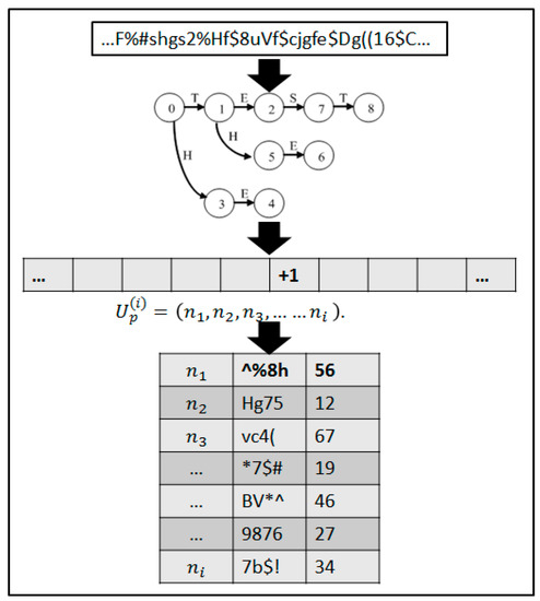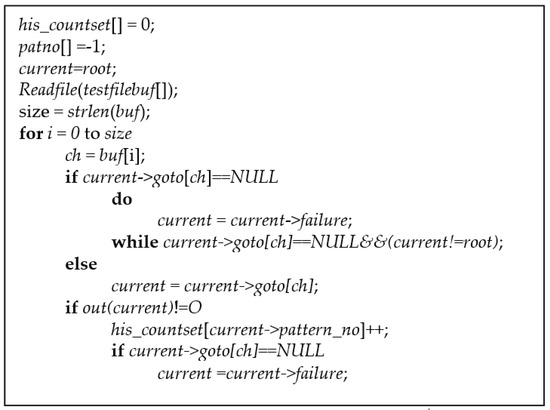 After building an AC state tree, the text data is input for searching. is a string, and the AC state tree searches for patterns by reading the characters of string one by one. In the searching function of the ACC algorithm, when a pattern in is found, yhe counting value is set by Equation (2).