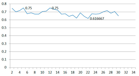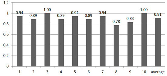 From Figure 18, we can see that the average accuracy is 91%. The signatures of different persons were tested under different experiments. We obtained a different parameter combination, as shown in Table 4. We can see that the most common sample rate for testing different persons’ signatures is 5. The most common resolution is 18, and the pattern length is always 4. Thus, we can set the resolution r = 18, sample rate , and pattern length for general use in real-world application.