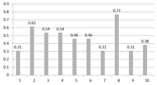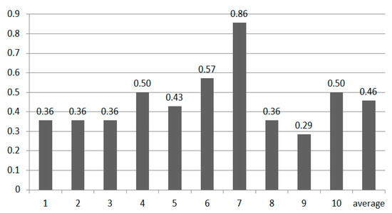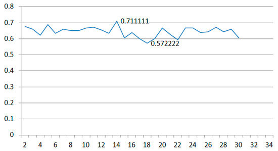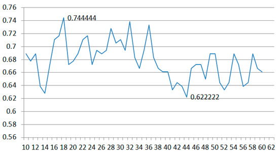 The Euclidean distance algorithm is used to calculate the distance of two data. The input signature data, which are the same as in ACH algorithm, are two vectors. These two data also need to be pre-processed first. Equation (14) is the method for calculating the distance between two signature data. Figure 19 is the accuracy of the Euclidean distance algorithm. We can see the result is not good. Most of the accuracy is below 50%; the average accuracy is only 46%.