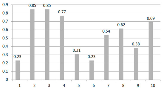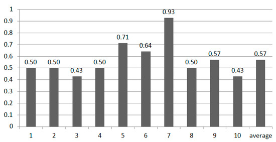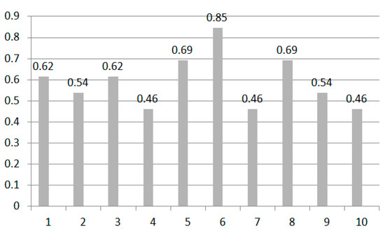 The correlation algorithm uses the statistical correlation concept to calculate the similarity of two vector data. The correlation algorithm is calculated by following Equation (15). Figure 20 is the accuracy of the correlation algorithm. We can see the result is better than the result obtained from the Euclidean distance algorithm. The average accuracy is only 57%, but it is still far below normal accuracy.