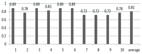 Figure 17 is the accuracy for testing different persons’ signatures under the same condition with , , and . The average accuracy is 81%. If the experiment is processed under different conditions for different people, we find the accuracy is higher. Therefore, in the real application, it is better to use different parameters to identify different persons’ signatures.