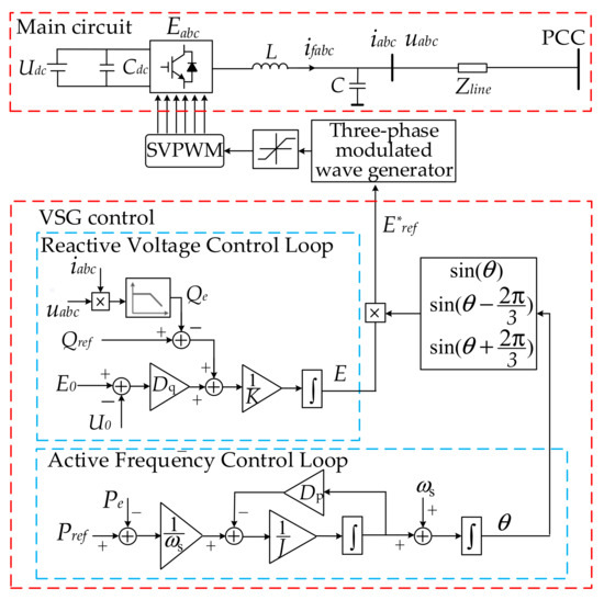 The VSG control scheme includes an active frequency control loop, a reactive voltage control loop, a three-phase modulated wave generator, and a space vector pulse width modulation regulator. The mathematical expressions for the active frequency control loop and the reactive voltage control loop are given in (1)–(3).