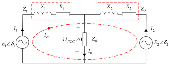 Using the parallel system of two VSGs as an example, the equivalent circuit diagram is shown in Figure 2. In the figure, Ei and δi (i = 1, 2) are the output amplitude and phase angle of the VSG equivalent voltage source. δi is usually small, and it can be approximately regarded as sinδi = δi, cosδi = 1. UPCC is the voltage amplitude of the PCC. Zi is the equivalent output impedance, and φi is the equivalent output impedance angle. Z0 is the load impedance. Ii, I0, and Icc are the VSG output current, load current, and system circulating current, respectively.