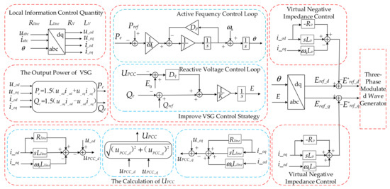 where RV and LV are the virtual resistance and virtual inductance values, respectively; Eref_d and Eref_q are the d-axis and q-axis components of the reactive voltage loop output reference voltage, respectively; i_od and i_oq are the d-axis and q-axis components of the output current, respectively; and E*ref_d and E*ref_q are the references for the three-phase modulated wave generator after virtual impedance correction. The block diagram of the integrated control strategy is shown in Figure 4.