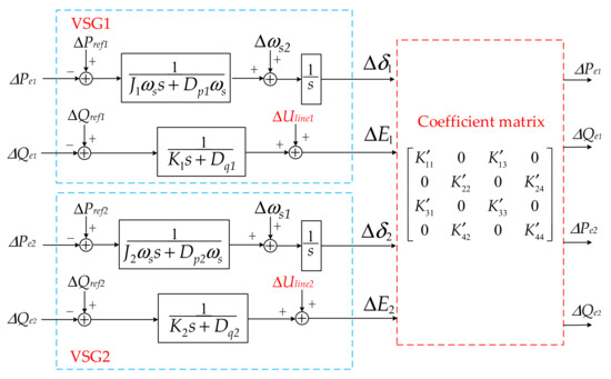 To visually analyze the difference between the integrated control strategy and the traditional VSG control strategy in terms of power decoupling and the precise distribution of reactive power, the two parallel VSGs in Figure 2 are used as an example for analysis. First, the first amplification factor matrix and relative gain matrix [25] are introduced to quantitatively compare and analyze the decoupling control effects of the two different control strategies on the active frequency and reactive voltage. Second, the small-signal model of a two-machine parallel system is built to verify the degree of accurate distribution of reactive power theoretically.