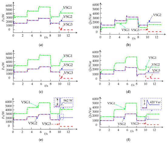 The simulation operating conditions are set as follows. The common load (6.2 kW + j3.8 kVar) is initially supplied by the three VSGs operating in parallel. When t = 3 s, the load suddenly increases; that is, the common load changes to (9.1 kW + j7 kVar). When t = 5.5 s, the load suddenly increases again; that is, the common load changes to (11.3 kW + j9.9 kVar). When t = 8 s, the common load returns to the initial operating state. When t = 10 s, VSG3 exits, and VSG1 and VSG2 share the common load.