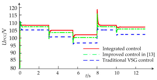 The root mean square (RMS) of UPCC with different control strategies is presented in Figure 7 and Table 4. As shown in Figure 7, the traditional VSG control cannot compensate for line impedance voltage drop, and voltage at the PCC deviates seriously from the rated value of 110 V. When load power suddenly increases, line impedance voltage drop ΔUline also increases, worsening the common bus voltage of the system. When the load power suddenly increases to (11.3 kW + j9.9 kVar), the voltage deviation of UPCC (ΔUPCC) will exceed 10%. The improved control strategy proposed in [13] dynamically adjusts the output voltage of a system by combining reactive power and virtual inductance. Compared with that in the traditional VSG control strategy, the ΔUPCC, as shown in Table 4, is smaller. However, this strategy does not consider the voltage drop of the benchmark virtual inductance. Moreover, it intensifies the voltage drop in the presence of a large load disturbance. The integrated control strategy proposed in the current study compensates for the line impedance voltage drop ΔUline based on the VSG output terminal voltage, and it equivalently realizes control voltage forward shift, avoiding the phenomenon of UPCC drop caused by a change in common load power and the introduction of virtual impedance. When the load power has a large-scale, sudden increase disturbance (e.g., 11.3 kW + j9.9 kVar), the percentage of voltage sag deviation of UPCC with the integrated control strategy is 40% and 18.9% lower than that with the other two control strategies, respectively. It realizes precise droop control between reactive output power and common load terminal voltage UPCC.