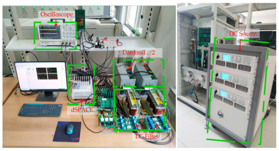 To verify further the correctness of the preceding theoretical analysis and simulation results, a two-machine parallel experimental platform is built in a laboratory, as shown in Figure 8. The AINO AN51030-600 DC source is used in the DC side, Danfoss is used in the inverter circuit, and the control signal is outputted by the dSPACE real-time simulation controller. The primary circuit and control parameters of the experimental platform are consistent with those in the simulation control system.
