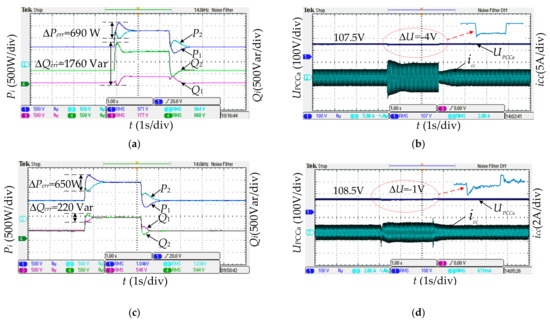 Waveforms of the experimental results using different control strategies in experimental condition 1. (a) The traditional VSG control strategy outputs power waveform. (b) The traditional VSG control strategy outputs the voltage effective value of UPCCa and circulation waveform. (c) The integrated control strategy presented in this study outputs power waveform. (d) The integrated control strategy presented in this study outputs the voltage effective value of UPCCa and circulation waveform.