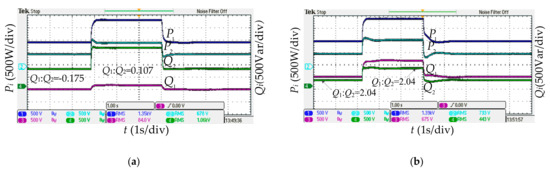 The capacity of the two-machine parallel system is set to 2:1, and the operating conditions are consistent with those of the former. The waveform diagrams of the power output results using the two different control strategies are presented in Figure 10. As shown in the figure, the two control strategies can complete the output of active power capacity configuration. However, when the traditional VSG control strategy is adopted, reactive power output does not meet the configuration requirements, and the ratio of output power to capacity is the opposite. This finding is consistent with the simulation results. The specific steady-state values of reactive power are provided in Table 6. When the integrated control strategy is adopted, the reactive power of the system basically meets the set value of 2:1, verifying the effectiveness of the control strategy in parallel with different capacities.