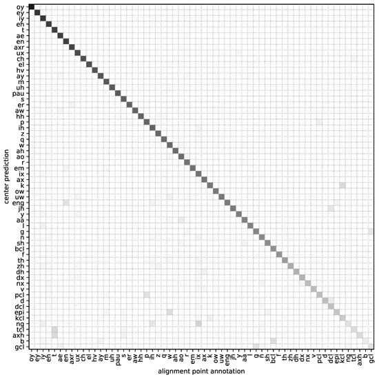 In the smaller W2P_shallow model, 44 phonemes are correctly aligned in the majority of instances. A smaller alignment offset is also observed for all closure symbols. More specifically, all closure symbols except for gcl and tcl are aligned without error in most of the instances.