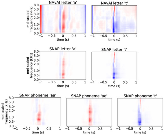 Comparison of NAvAI patterns with input layer SNAPs in model W2L for letters and phonemes. The plots visualize the difference of intensity of frequencies between group-average and the average over the complete data set. White indicates zero difference, red and blue color indicate higher and lower intensity, respectively. Lighter color also indicates small importance for the prediction. Colors represent the same values only for subfigures in the same row.