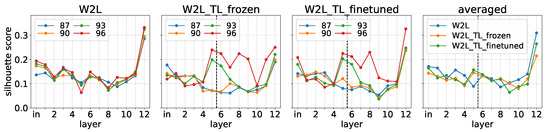 We evaluate whether SNAP clustering can indicate representational quality. To this end, we first investigate Silhouette score correspondence to a ground truth obtained through transfer learning and, based on the findings, inspect the emerged clusters in specific layers. For this evaluation, we compare the three models W2L, W2L_TL_frozen and W2L_TL_finetuned (compare Section 4.2).