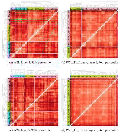 Clustermaps for W2L (a,c) and W2L_TL_frozen (b,d) in layer 4 (a,b) and 5 (c,d) at the percentile with highest change of Silhouette score from layer 4 to layer 5. Heat map colors do not represent same distance values in different plots. Colors of clusters in different subfigures do not represent mapping of the clusters. See Figure 7 for an enlarged clustering view.