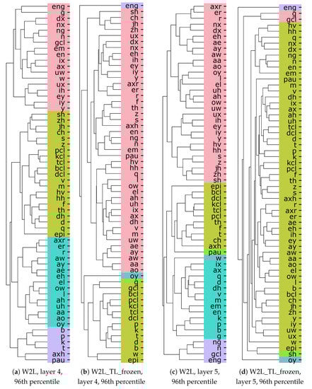 The W2L model, in contrast, showed more distinct subclusters in both the 4th and 5th layers. The number of clusters is the same in both layers but the sets of phonemes being assigned to the same cluster is substantially different. 35.4% of phoneme pairs change from being assigned to the same cluster to being in different clusters or vice versa. At the same time, distances between SNAP in the W2L model are much higher and vary more than in the transfer learning model. Phoneme clusters in the W2L model indicate that the model encodes high-level concepts of similar sounds. For example, the red cluster in the 5th layer (Figure 6c and Figure 7c) contains most vowels.