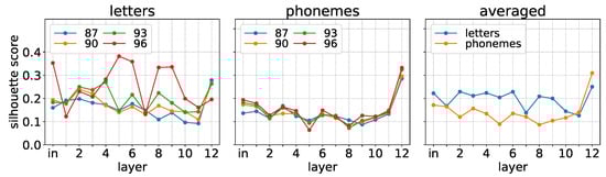 We applied hierarchical clustering with Euclidean distance and complete linkage [52] to NAPs of letters and phonemes in our previous work [9], using a fixed threshold for the emergence of clusters. Here, we investigate the clustering approach using different distance thresholds at percentiles 87% to 96% in steps of 3%. We empirically found these thresholds to lead to different numbers of clusters for our model. Applying the clustering algorithm to other models might need other thresholds if distance value range or distribution are different due to model properties, for example the used activation function. For quantifying the quality of the clustering result, we compute its Silhouette score [53]. The Silhouette score is a measure of how similar instances in the same cluster are to each other compared to their similarity to instances of the nearest other cluster. In the context of SNAPs, a high clustering quality in terms of Silhouette score indicates that the set of observed groups is separable into disjunct subsets, such that groups in the same set activate neurons similarly and groups of different sets activate neurons differently. The resulting subsets are potential high-level concepts that the network learned to encode in the respective layer. However, high clustering quality does not guarantee that this concept is meaningful to human interpretation. Therefore, evaluating whether the clusters are interpretable subsets of groups still requires to manually inspect the clusters. In addition to investigating the Silhouette scores at individual distance thresholds, we further investigate the average Silhouette score over the four used thresholds in each layer.