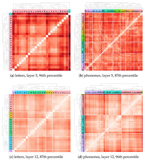 Clustermaps of SNAPs of the W2L model in layers 5 and 12 using grouping by predicted letter and annotated phoneme. Each subfigure shows the clustering at the respective percentile of best quality according to Silhouette score. Equal heat map colors represent same distance values in the same layer, but are not comparable between layers. Colors of clusters in different plots do not represent mapping of the clusters. An enlarged view of the clustering without the heat map of pairwise distances is shown in Figure 10.