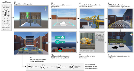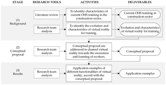 This work reviews the intersection between the current OHS (occupational health and safety) training methodology with the possibilities of virtual reality, through a series of elements identified as key to advance towards a personalized solution that actively involves workers in their learning, promoting automation in the creation of these VR experiences, and the use of narratives (focused on emotional content). The developments shown are focused on building projects but can be applied to other types of construction projects. Figure 1 shows the stages of research: (1) background; (2) conceptual proposal; and (3) results.
