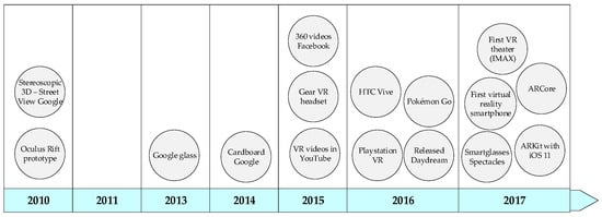 - AcceleratingBiz. AR/VR Development Rapidly Picked up between 2010 and 2017 as Big Tech Firms Significantly Invested in Hardware and Software Releases. Augmented and Virtual Reality Timeline. Available online: https://acceleratingbiz.com/proof-point/augmented-and-virtual-reality-timeline/ (accessed on 21 May 2020).