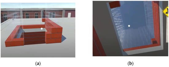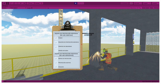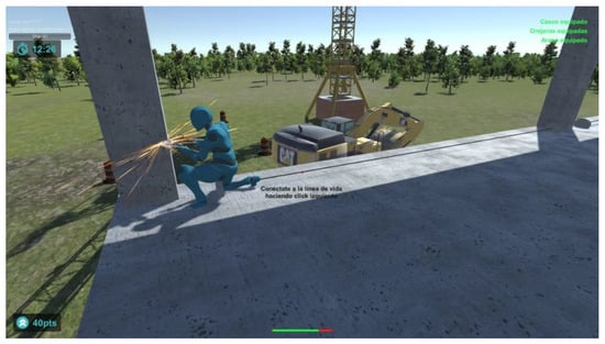 The second point requires programming, a code not much different from that used for video games and specialized platforms, with functionalities that allow the incorporation of risks through development at a high-level programming level, through environment parameters and menus, or through low-level languages, writing lines of code. The choice of one or the other will depend on the type of demanded casuistry [60]. Figure 6 shows an example, where the player falls when interacting in an area without collective protection elements (safety fences).