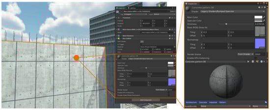 A first use of Unity3D® responds to these basic features: importing of a CAD or BIM geometric model of the building site and its enrichment through several properties. That is, the assignment of materials (as shown in Figure 7) and inclusion of complementary objects (neighboring buildings, vegetation, work tools, etc.). In the implementation results shown below, data from a real building were obtained. This is an office and laboratory building of the Universitat Politècnica de Catalunya (Spain). It consists of four floors and one subway floor, designed in reinforced concrete. The BIM models contain geometrical information, materiality data, and construction process data. Once in the context of virtual reality experiences, these materials acquire two uses: (a) visual, for aesthetic purposes; and (b) physical, for motion simulation and object interaction purposes. In VR and unlike CAD/BIM packages, the user is able to interact with the environment and to respond according to a programmed physical engine. As an example, users cannot pass through walls but could move a fence or net depending on its consistency and anchorages.