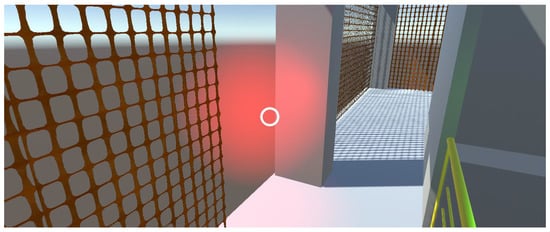 On the other hand, the use of additional objects to those traditionally used in BIM/CAD packages also has a dual purpose: (a) aesthetics, such as vegetation and people in the renderings of buildings; (b) functional, for the learning objective, in this case the interaction of the user with the work elements attending to an adequate OHS, which directly refers to the use of CPE and PPE. For example, Figure 8 shows a light alert, which indicates a danger zone in the worker’s path through the virtual environment.