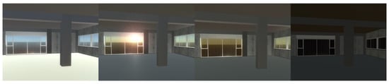 The incorporation of cameras and lighting, equivalent to design software, is an important element for virtual reality experiences, highlighting two relevant aspects: (a) it is common to select the camera in the “first-person shooter” (FPS) format, according to video game terminology), which has a direct impact on user experimentation through the eyes of the protagonist, which is key to enhancing the immersion and worker involvement in the experience; (b) although lighting appears to be an additional photorealistic supplement of no particular importance, note that it is related to a set of risks that deserve separate attention, such as glare from the sun or, in opposition, falls and accidents due to poor visibility, as shown in Figure 9.
