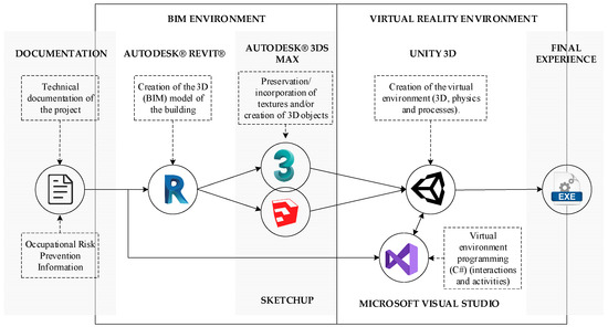 The technological tools for the implementation of the workflow and the development of virtual reality experiences are shown in Figure 11. Tools from BIM environments (Autodesk Revit), general 3D modeling tools (Autodesk 3DS max and Sketchup), scenario generation and interaction in virtual environments (Unity 3D and Microsoft Visual Studio), and the subsequent user interaction, through various devices (HTC Vive, Oculus, Cardboards, smartphones/tablets) are linked). In addition, Table 1 shows the details of the tools used (hardware and software).