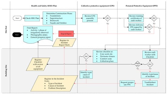 This whole process can be extended to several types of construction workers, using the same workflow and technological tools. A significant profile is that of the prevention technicians, who require a slight variant in approach. Their mission is not to avoid risks for themselves, but for other workers. They must identify the risks, label the spaces and machinery, verify the installation and correct use of all the CPE and PPE required by the area and each worker. A virtual reality walkthrough can be built replicating what a site visit would be for inspection of the OHS measurements. This VR experience can be adapted as tasks progress and the site changes, as prevention measures also evolve with work schedule. Figure 12 shows the workflow associated with this process.
