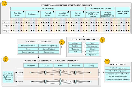Figure 19 shows a map with the elements and workflows for the systematic development of narratives in the creation of virtual reality experiences. The story is articulated via its contents and the key elements of a plot diagram to map the events in a story. The story (Box A) draws on the structured compilation of stories about accidents, from the perspective of those who suffered or witnessed those experiences, which is broken down into all its components: accident context (role of the worker, emotionality, personal aspects, immediate surroundings, and general aspects), state before and after accident (cause-effect relation-ships of accidents), and singular aspects of the story (singularities due to the human factor, for example). Thus, for example, in the “accident context > worker role”, n categories of worker roles can be established. On the other hand, each accident history will have one of these roles (A, B, C, …, n), which must be indicated. Similarly, the data for the other accident stories are collected and classified and for the following categories. With the different accident stories, common and standardized elements it is possible to obtain and generate a database and guidelines for each type of accident.