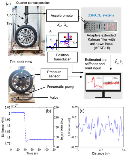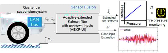 Therefore, the main objective of this study is to explore a new TPMS aimed at addressing the abovementioned issues of existing indirect TPMS. To achieve this research goal, adaptive extended Kalman filtering with unknown input (AEKF-UI) estimation of vehicle suspension systems is proposed for the new indirect-type TPMS in this study. After estimating the time-varying parameter of tire stiffness, the linear static relationship between the tire stiffness and inflation pressure is utilized to indirectly monitor the tire inflation pressure, as shown in Figure 1. While a vehicle drives on a road, the road acts as an unknown disturbance input to the vehicle suspension system. Thus, it is necessary to simultaneously estimate unknown road roughness input. In this study, road roughness can be obtained through the proposed algorithm. Compared with current indirect TPMS, the proposed system can simultaneously monitor the tire pressure (after estimating the tire stiffness) and estimate the unknown road roughness input. This is one of the advantages of the proposed method, because the measurement of road roughness is significant for understanding vehicle dynamics and for designing automotive control systems, but is typically challenging [11]. Furthermore, the proposed algorithm is more accurate and reliable because it is based on vehicle vertical dynamics, whereas most previous indirect TPMS methods suffer from inaccuracy due to the absence of a proper vehicle dynamic model. The quarter-car suspension model and the static relationship between the tire stiffness and inflation pressure are described in Section 2. The proposed algorithm and forgetting factor adjustment are described in Section 3. The simulation and experimental validation are presented in Section 4 and Section 5, respectively.