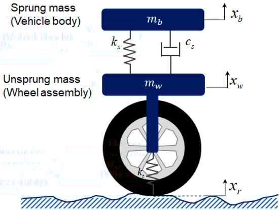 Various vehicle models have been developed for different purposes. Each model’s suitability depends on the performance evaluation criteria [12,13]. The quarter-car suspension model is designed in a two degree of freedom manner and primarily focuses on the behavior of the sprung mass (the mass of the vehicle chassis) and the unsprung mass (the mass of a single wheel, tire and shock absorber), while the tire is modeled as a linear spring (i.e., tire stiffness) in series with an unspring mass, as illustrated in Figure 2. This model is widely used in various studies to simplify the complexity of algorithms as much as possible while ensuring critical performance [14]. The fundamental assumption of a linear quarter-car model is to neglect the complex linkage effects, whereas a practical suspension system is more complicated from a kinematic point of view [15]. Hence, there is an inevitable model–reality mismatch. Nonetheless, the quarter-car model greatly reduces the complexity of the system, thereby being highly effective for embedded systems as compared with higher-order suspension models [16]. Due to these compelling advantages, many researchers have adopted a quarter-car suspension model for analyzing suspension performance or control and the passive-type quarter-car suspension model is utilized in this study. Road roughness () acts as an unknown input to be either measured or estimated. In this study, the unknown road input is simultaneously estimated by the proposed algorithm.