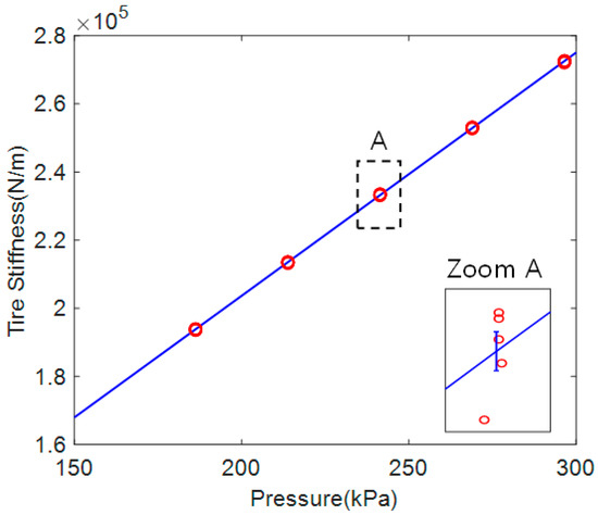 The key assumption of the proposed indirect TPMS is that it uses a linear relationship between the tire stiffness and the pressure. To validate the assumption, the vertical tire stiffness with the different tire pressures was measured using a tire test equipment (Flat-trac CT plus, MTS® system). Under the normal operation conditions (150 kPa~300 kPa), the relationship between the tire vertical stiffness and pressure exhibited linear characteristics. Typically, a vehicle tire possesses viscoelastic characteristics. However, this has been neglected in this study because the quarter-car suspension model-based TPMS is operated in response to transient inputs [20]. A commercial tire for mid-size passenger cars (type 225/45R17W, Hankook Tire) was used for the experiment. The measurements were recorded five times at different tire pressures and then averaged, as shown in Table 1. The measured vertical tire stiffness was linearly proportional to the internal tire pressure, as shown in Figure 3. The sensitivity curve was estimated using the following regression (curve fitting) formula ()