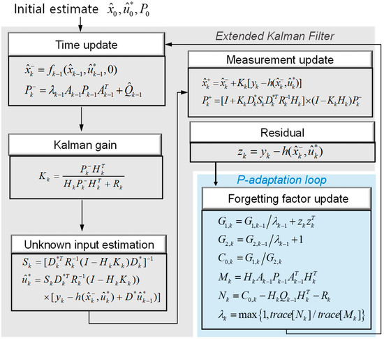 The terms “dynamic state” and “parameter estimation” can be traced back to the 1970s when Kalman filtering techniques were applied to improve the computational performance of the traditional state estimation process. System modeling and identification methods for nonlinear systems were developed using the extended Kalman filter (EKF). The EKF is an effective means of state and unknown parameter estimation. EKF algorithms can be derived from conventional Kalman filters [21,22]. Yang et al. proposed an extended Kalman filter with unknown input (EKF-UI) to estimate unknown earthquakes for health monitoring of structural systems in the field of civil engineering [23]. The derivation of the EKF-UI is briefly explained as follows: