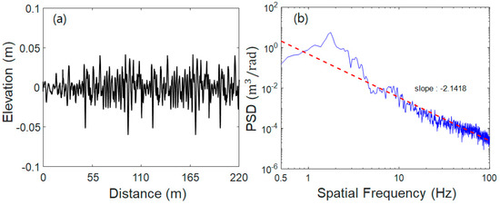 Unknown road roughness input for simulation; (a) measured road roughness at a vehicle speed of 20 km/h for 40 s and (b) its power spectral density function.