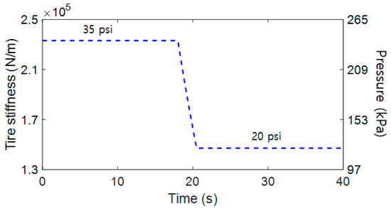 Tire pressure (i.e., stiffness) profile scenario for sudden pressure drop (241.3 kPa → 137.9 kPa).