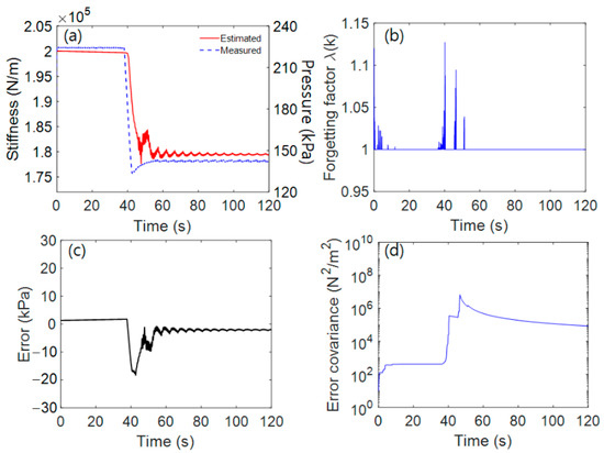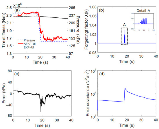The estimated tire stiffness using the proposed algorithm and the measured actual pressure are compared in Figure 12a. When the pressure suddenly drops from 224 kPa (normal) to 142 kPa (abnormal), the proposed algorithm can track this sudden drop in the inflation pressure and the tire pressure becomes steady-state (RMSE is 4.22). As the P-adaptation rule is applied to EKF-UI, the history of the error covariance matrix is examined to determine whether it has changed adaptively under optimality conditions. The forgetting factor history and the convergence history of error covariance in tire stiffness estimation are shown in Figure 12b,d. When the initial tire inflation pressure starts to drop from 38 s to 43 s, the error covariance is adaptively updated and eventually converges in real time because of the update of the forgetting factor calculated from (28). Figure 12d shows that the error covariance is weighted by the forgetting factor. The weighted error covariance matrix affects the time and measurement update process which results in time-varying parameter estimation.