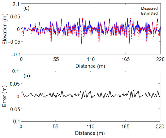 Simulation result of unknown road roughness input; (a) estimation of road roughness input, (b) estimation error between measured and estimated road roughness.