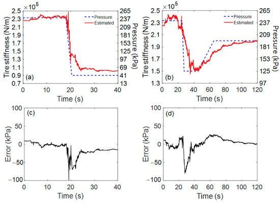To further investigate the effectiveness of proposed algorithm, different pressure profiles are employed. The tire pressure is set to be suddenly dropped from 224 kPa to 142 kPa (abnormal) and slowly recovered to 180 kPa by using a pneumatic pump. The tire pressure started to drop from 5 s to 10 s and slowly increased for 30 s, as shown in Figure 13a. Another pressure drop scenario was set to be gradually decreased from 220 kPa to 160 kPa for 30 s (i.e., different slew rate limited reference input) to represent the slow under-inflated tire status, as shown in Figure 13b. Although the estimated tire stiffness and desired tire pressure show some differences, these results seem to be acceptable for monitoring purposes.