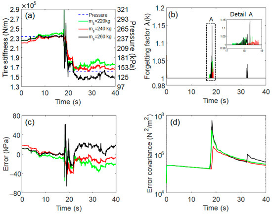 Experimental results of tire stiffness estimation with respect to different sprung mass; (a) response of time-varying tire stiffness, (b) time evolution of the forgetting factor, (c) estimation error and (d) convergence history of the error covariance (inset: detail A, around pressure change).