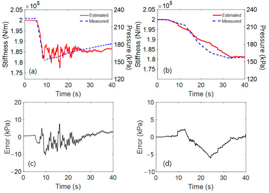 Simulation result of tire stiffness estimation with respect to different pressure drop scenarios; (a,c) time response of time-varying tire pressure to slew rate limited input (241.3 kPa → 41.4 kPa) and (b,d) time response for arbitrary pressure change (241.3 kPa → 138 kPa → 195 kPa).