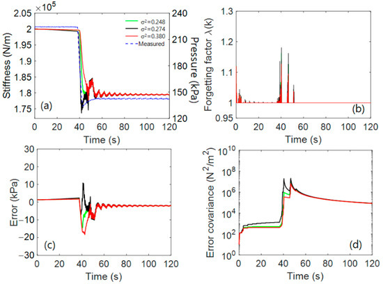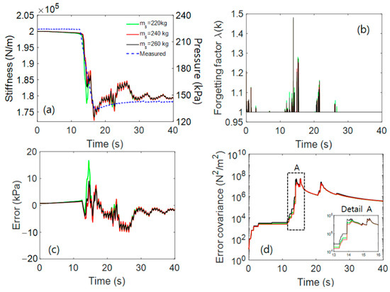 In general, the Kalman filter is robust against mismatched process noise covariance due to parameter uncertainty [32,33]. Thus, the tire stiffness response of the quarter-car suspension model with variable sprung mass was examined to investigate the robustness of the proposed algorithm, because the variable sprung mass depends on the number of passengers and one of the significant model uncertainties (i.e., mismatched process noise). The nominal sprung mass of the suspension model (240 kg) was perturbed by −8% (220 kg) and 8% (260 kg), respectively, as shown in Figure 10a. The estimated tire stiffness and actual pressure input show good agreement. The simulation results show a good robustness against the model uncertainty such as the variation of sprung mass because the estimation error shows no significant changes, as listed in Table 3. Because of the P-adaptation, the magnitudes of the forgetting factor and error covariance for the perturbed sprung mass are more peaked compared to nominal (240 kg). The adaptive forgetting factor also allows the compensation of model parameter uncertainty due to variable sprung mass. The peak magnitude of error covariance histories is also closely related to the RMSE.