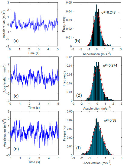 To further illustrate the robustness of AEKF-UI, the effect of electrical noise on the estimation performance was examined [34]. The white Gaussian random noise was added to the measured acceleration of unsprung mass. Because the random noise (error) can be fitted to a normal Gaussian distribution with the variance , as shown in Figure 15b, it was confirmed by white Gaussian noise. An original random noise has been modified to produce the more contaminated Gaussian noise, as shown in Figure 15d () and (f) (). The experimental results show a good robustness against the Gaussian random noise extracted from acceleration sensor signal, as shown in Figure 16. The estimation error shows no significant change, as listed in Table 5.
